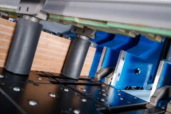 Bočne hvataljke precizno pozicioniraju uske trake pored bočnog vodila tokom rezanja u finalne dijelove.