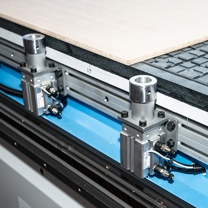 Mašina ima deset nultih tačaka izrađenih od čvrstog aluminija. Podignute su i spuštaju se pneumatskim cilindrima. Integrisane su sa letvom i sigurnosnim senzorima koji sprječavaju eventualne greške ili povrede. Vodilica spojena na nulte tačke pomaže preciznijem pozicioniranju obratka i služi kao vodič za sigurno izbacivanje komada, naročito onih nepravilnog oblika.