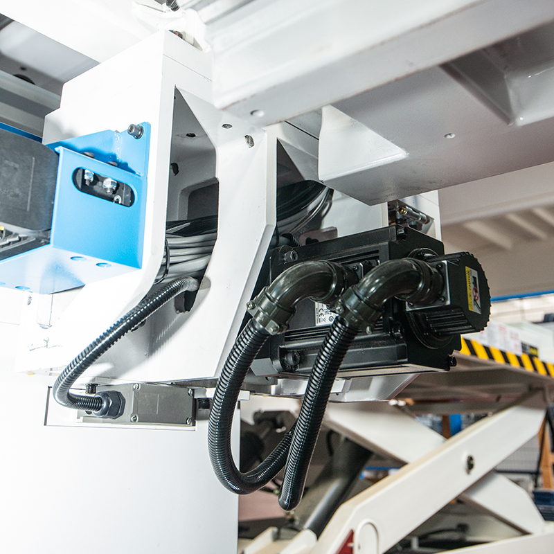 Precizno pozicioniranje i brzi pokreti ostvaruju se pomoću dva snažna, elektronski sinhronizovana DELTA servo motora snage 1300 W za maksimalnu tačnost i ubrzanje. Delta frekventni pretvarač i japanski zupčanici Simpo osiguravaju visoku preciznost.