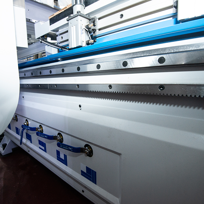 - Radni sto je tipa “matrix” sa šest vakuum zona i dvije Becker vakuum pumpe ukupnog kapaciteta 500 m³/h, što omogućava stabilnu obradu čak i manjih komada.