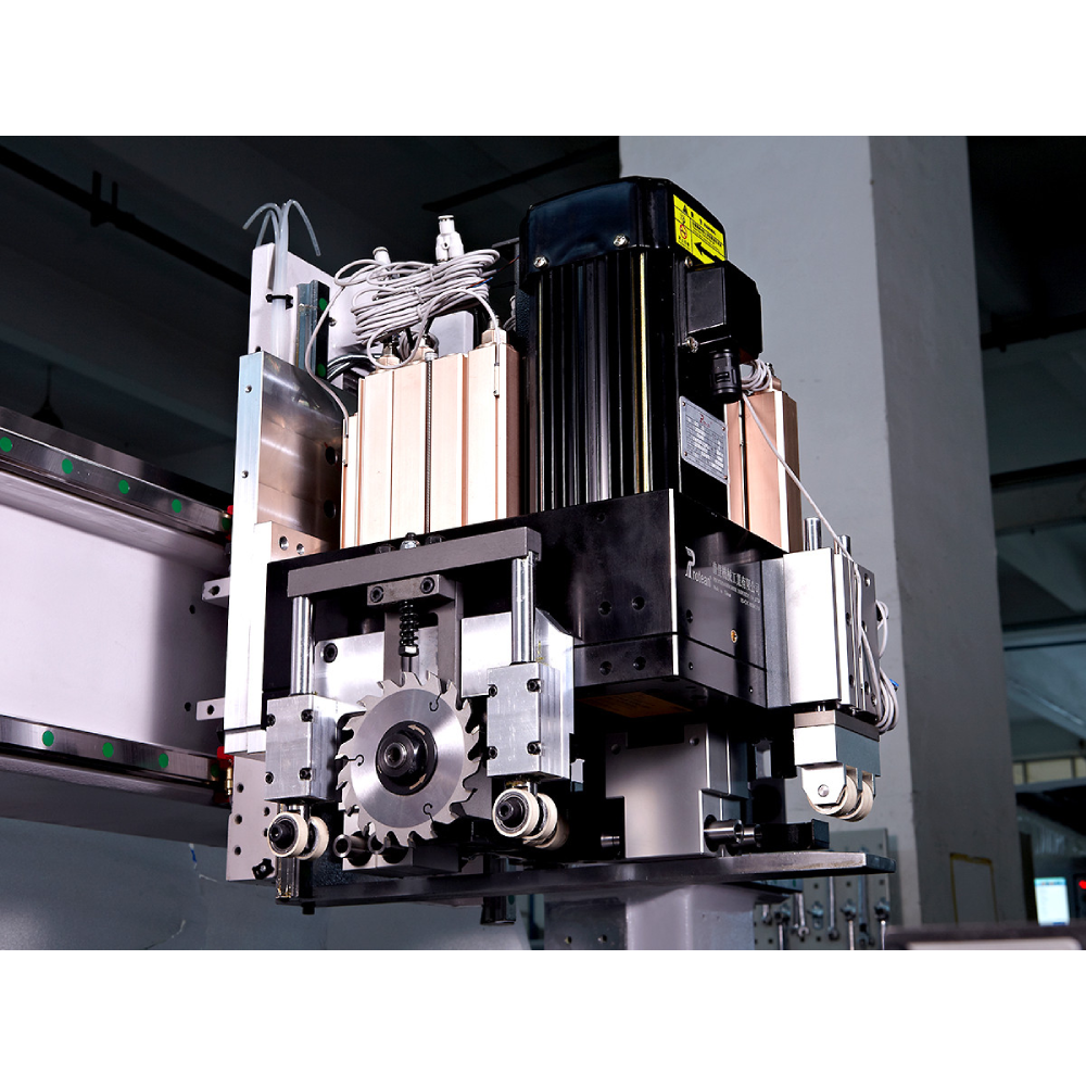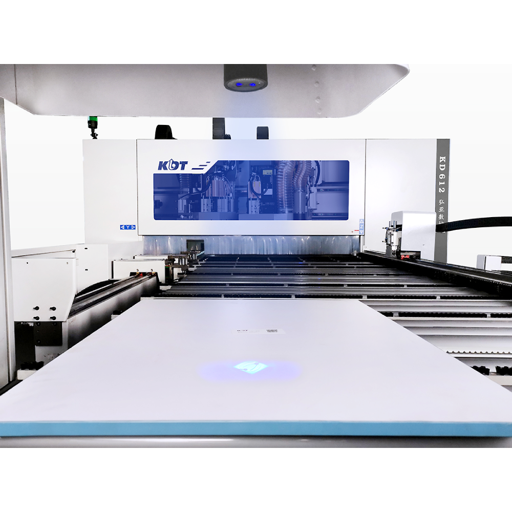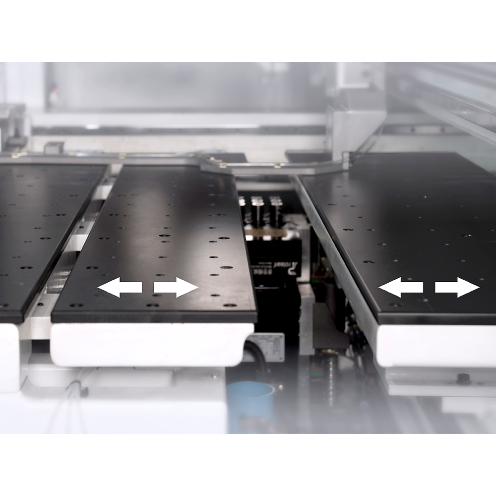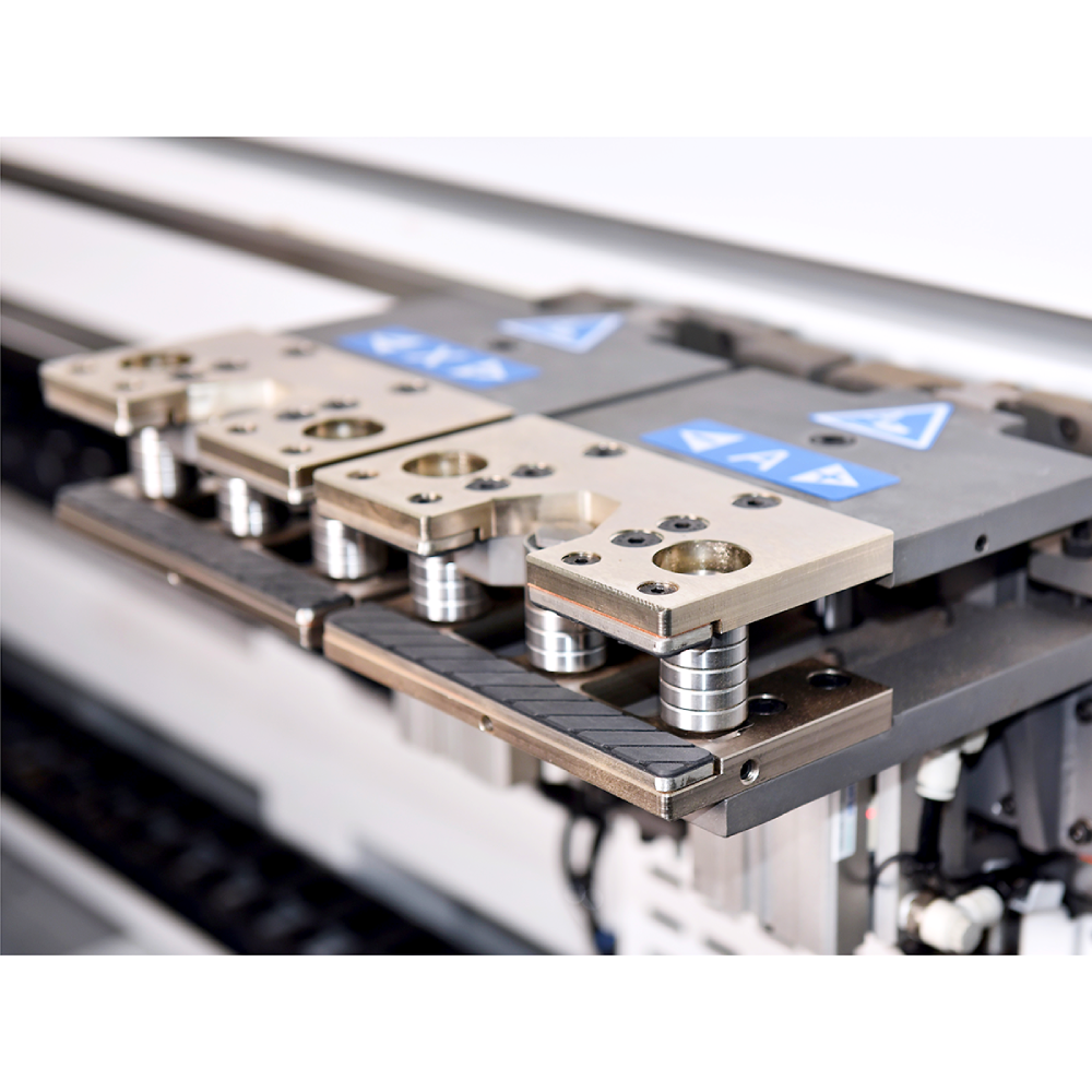 Stroj je opremljen parom neovisnih kliješta i automatski detektira rupe kako bi se izbjeglo da se kliješta zakače. Duljina vodilica kliješta je 5500 mm za obradu dugih komada bez hvatanja kliješta. Dvostruki zračni radni stol za lakše pomicanje izradaka, posebno izradaka s osjetljivom površinom.Dvostruka kliješta za brži rad i preciznije držanje. Pokretna traka za premještanje otpadnog materijala iz stroja.